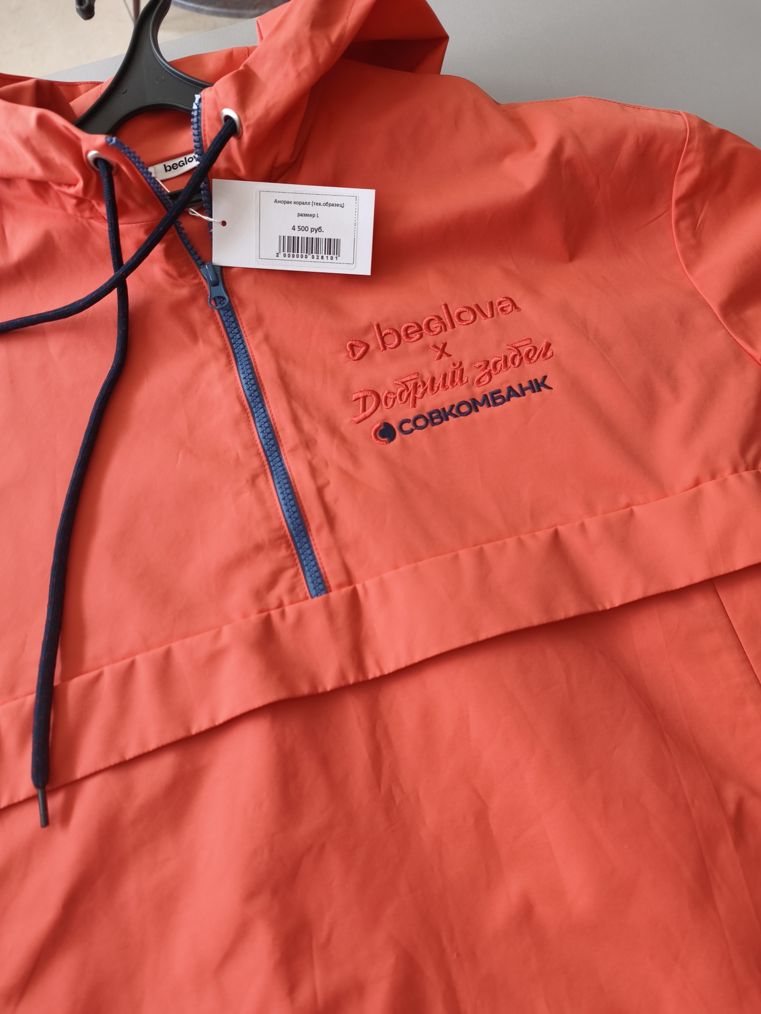 Технический образец. Все сшито идеально, но молния была подобрана не в цвет (отличается от оттенка синего шнура в капюшоне), плюс сделана фирменная вышивка в рамках спонсорского участия с Совкомбанк.