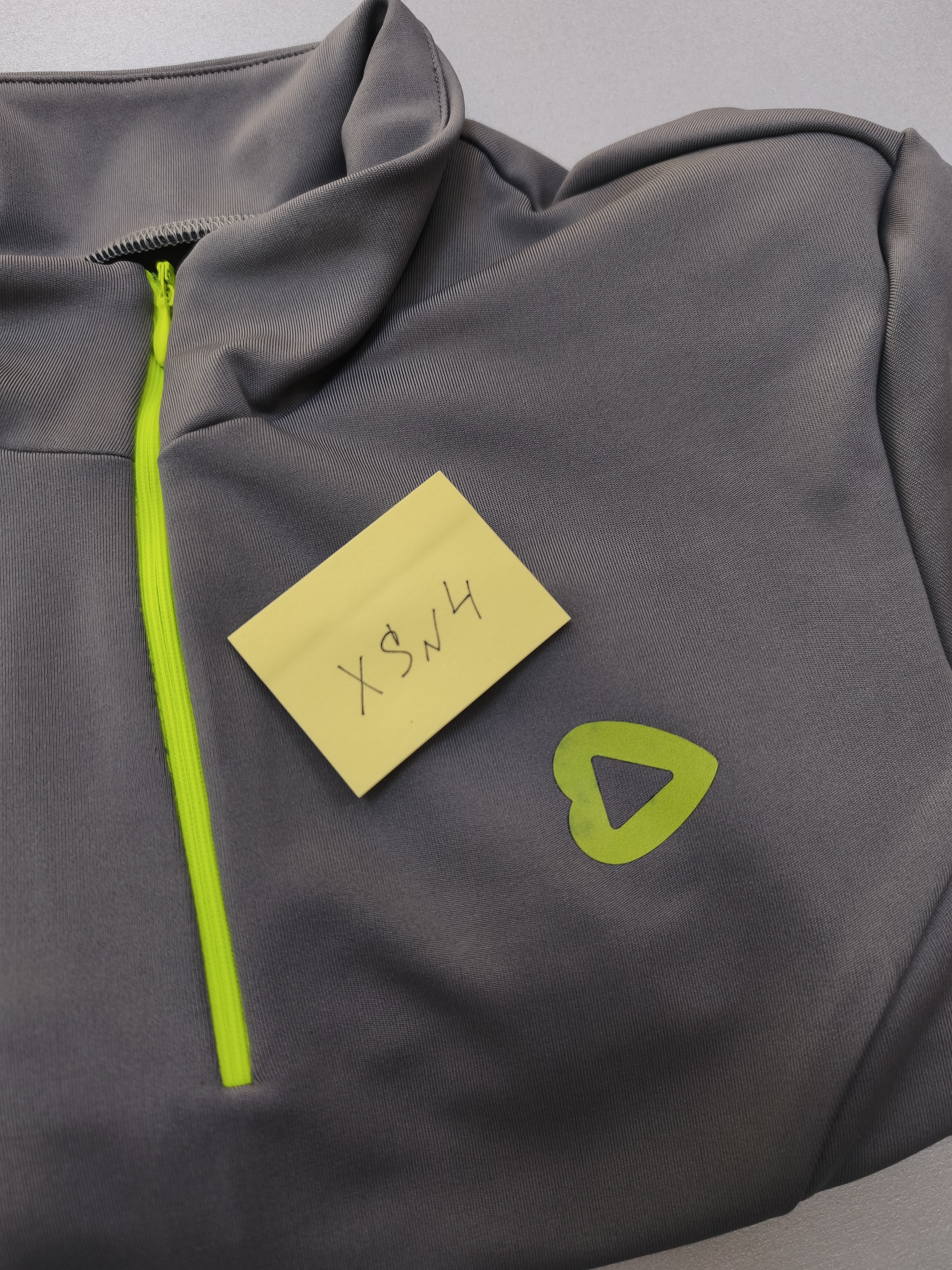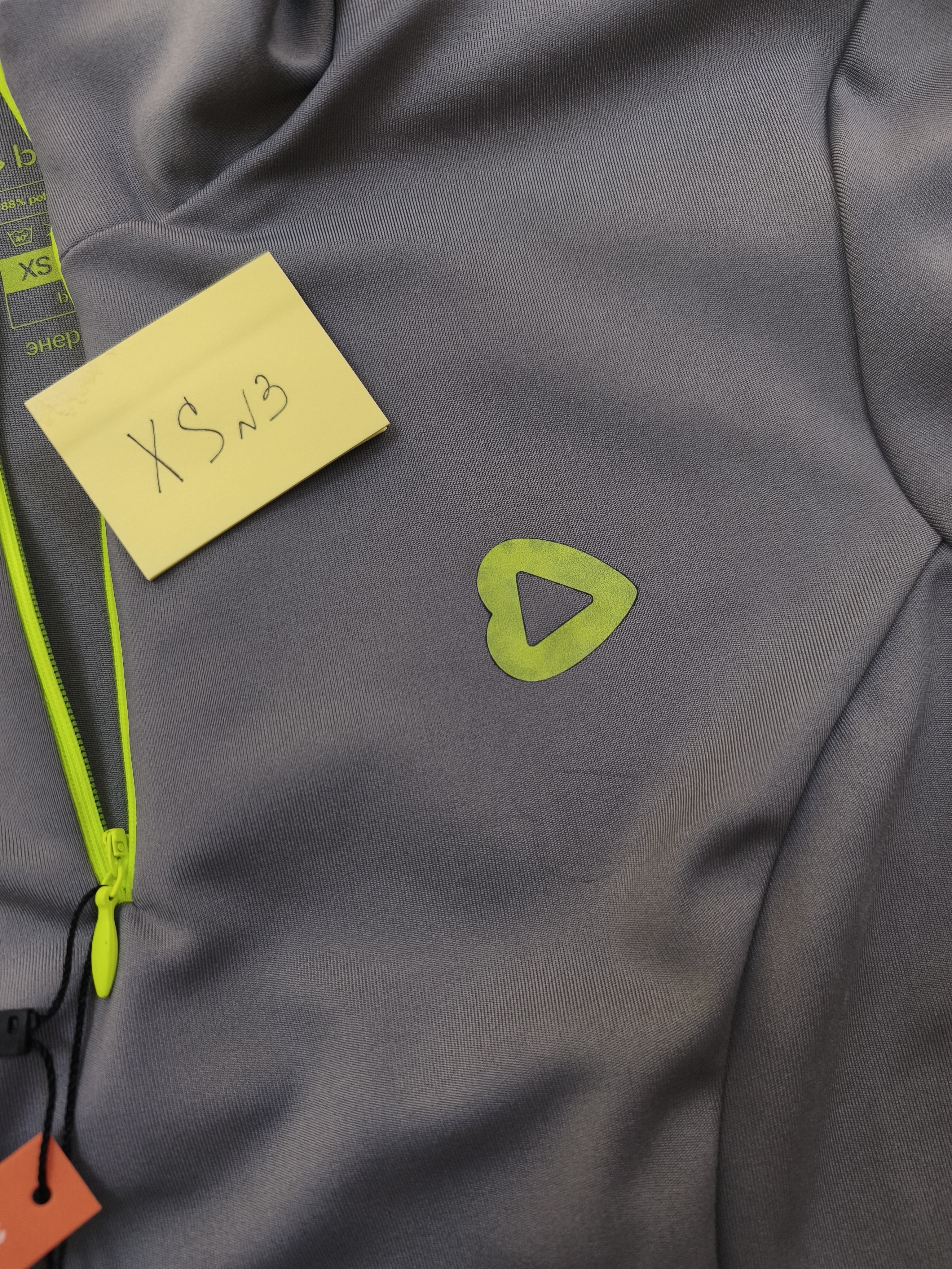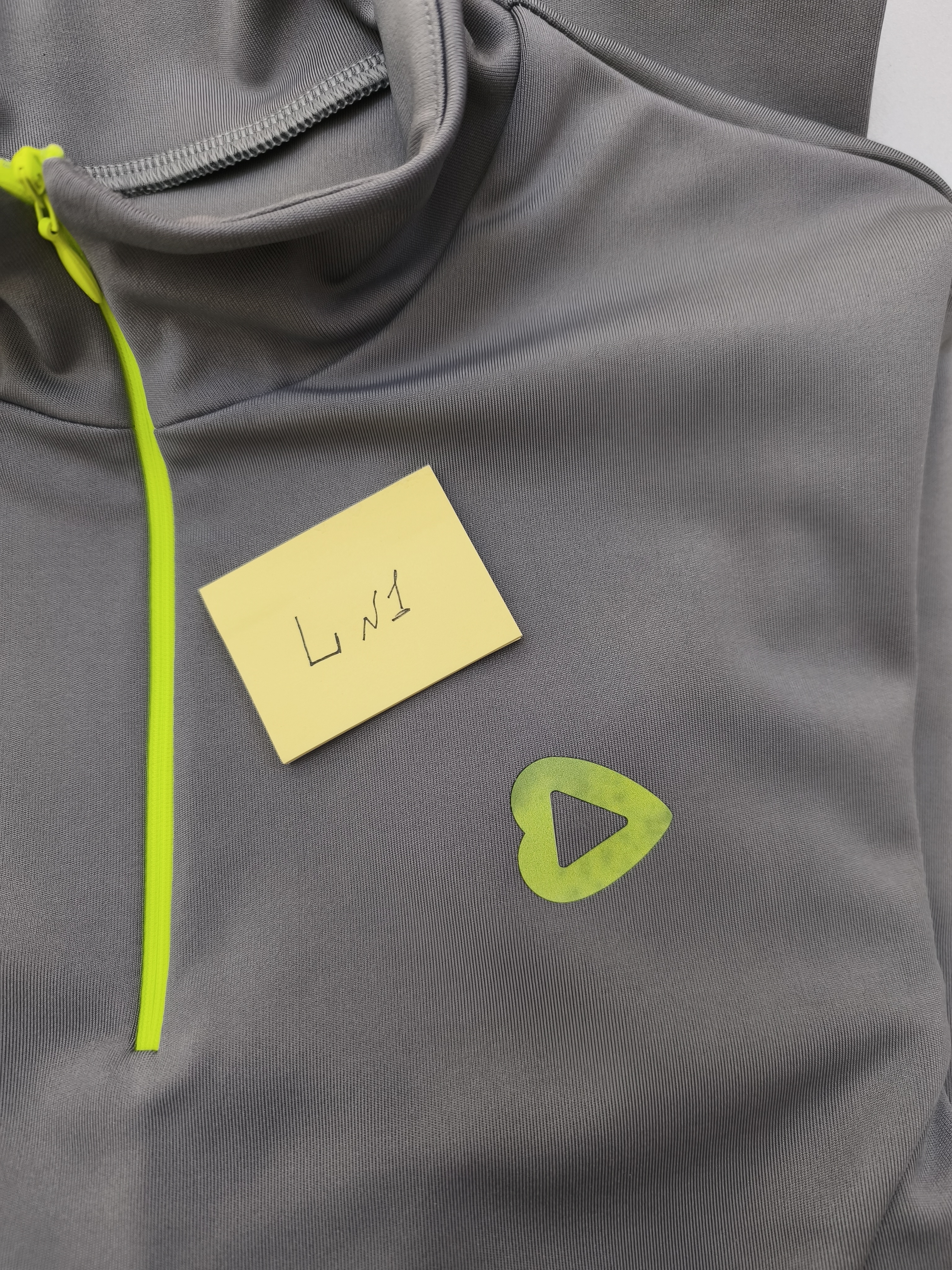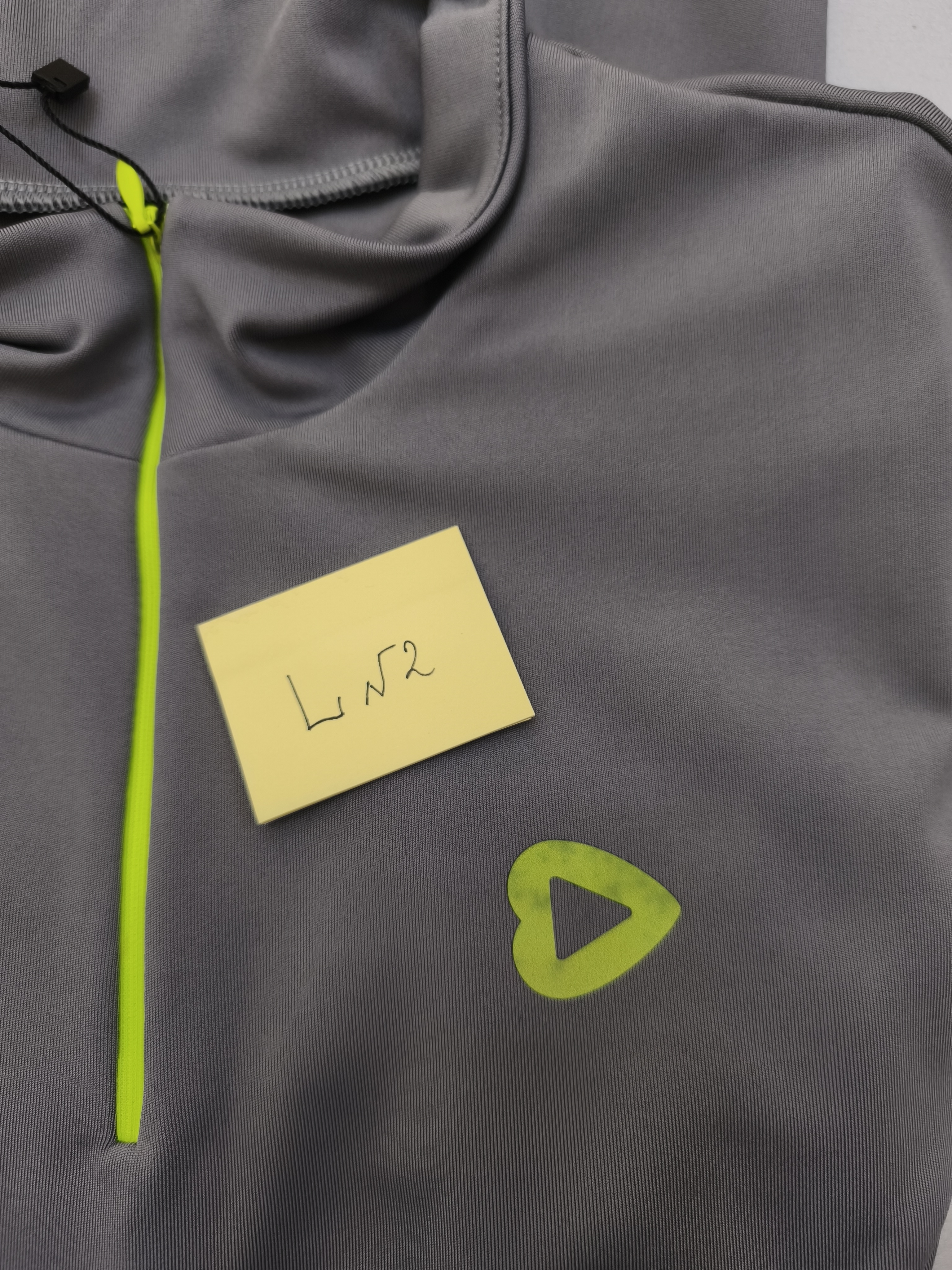 Лонгсливы в сером оттенке с акцентной неоновой молнией - абсолютно идеально ошиты, но в зоне брендинга (логотип сердечко) фрагментами стал меняться цвет.