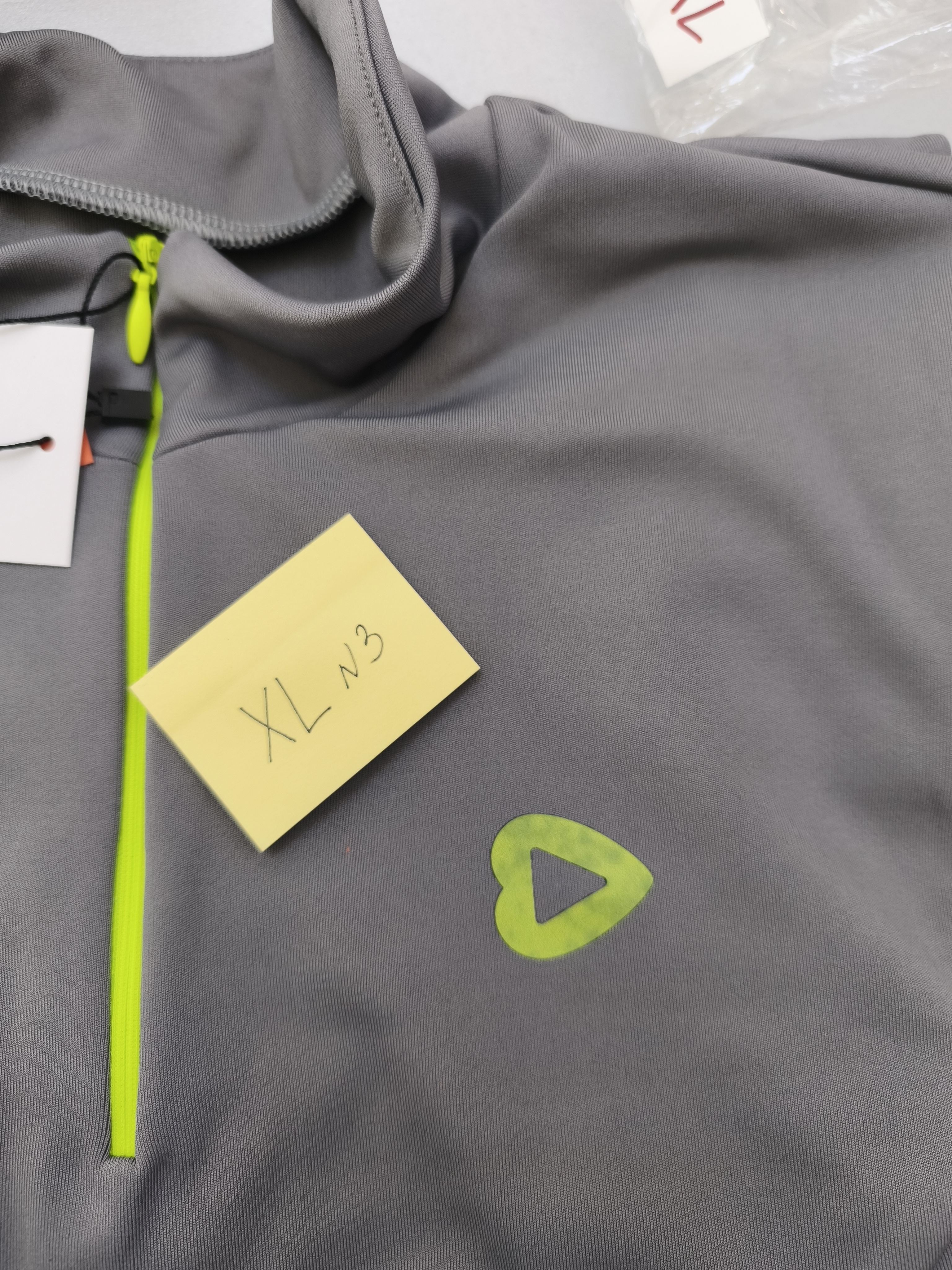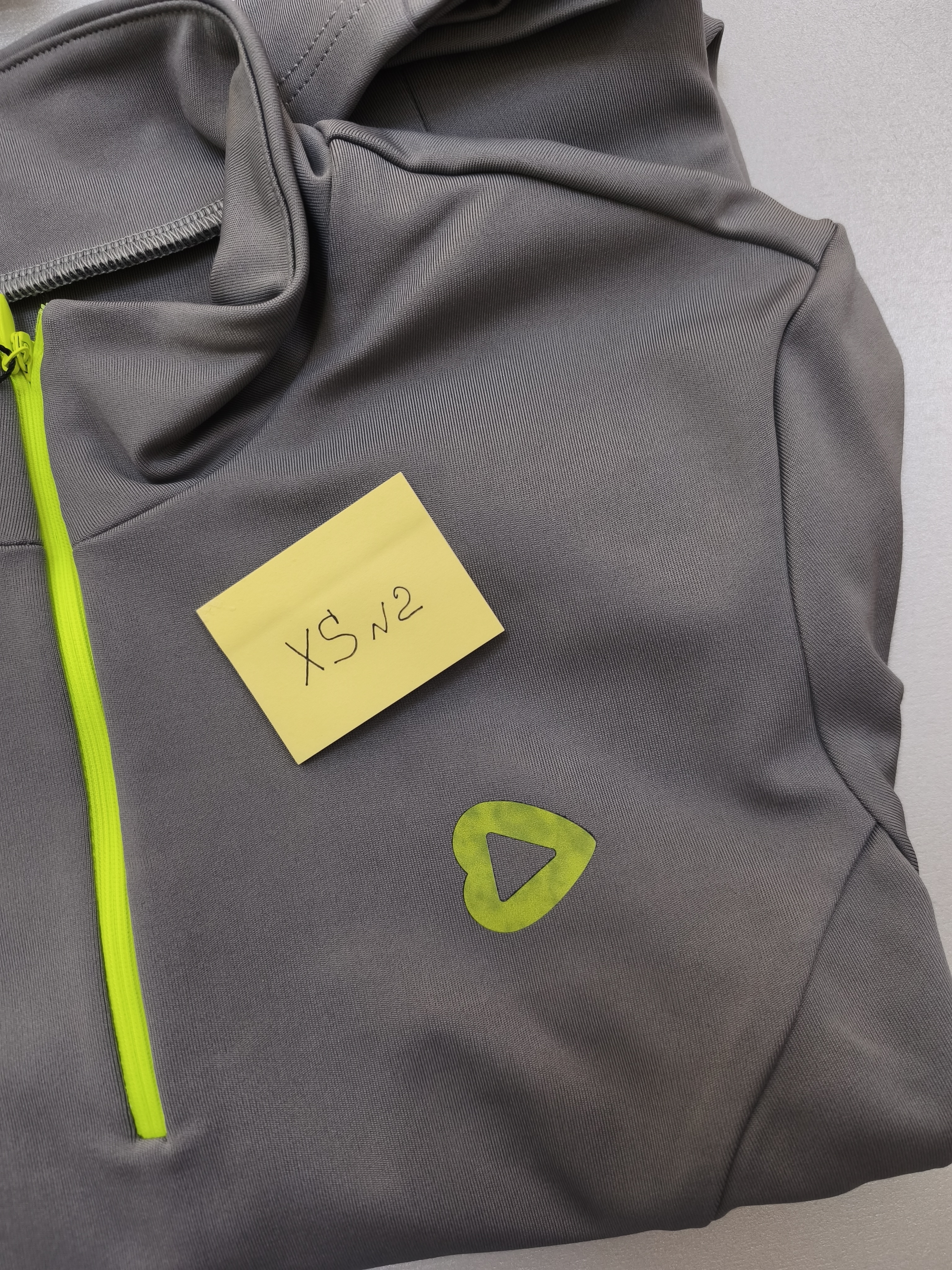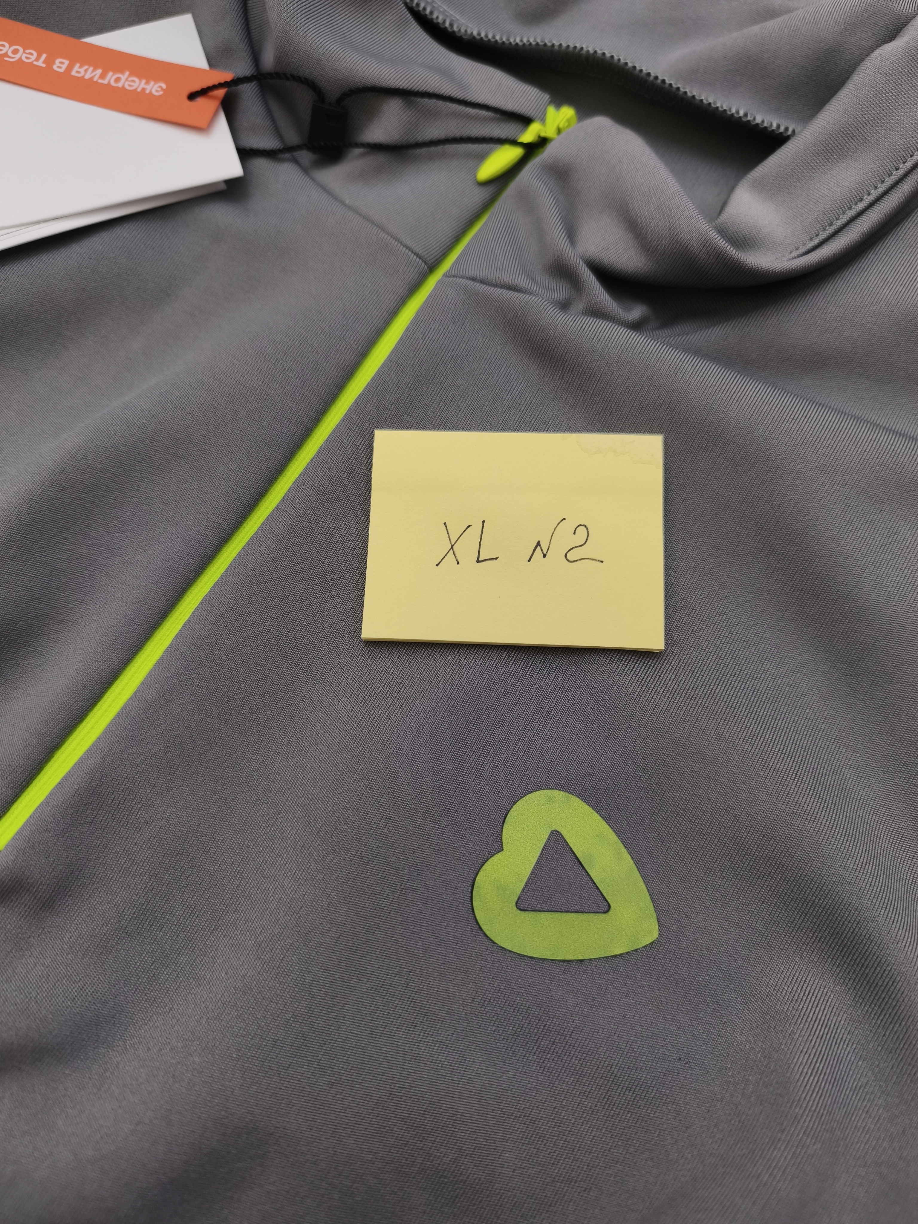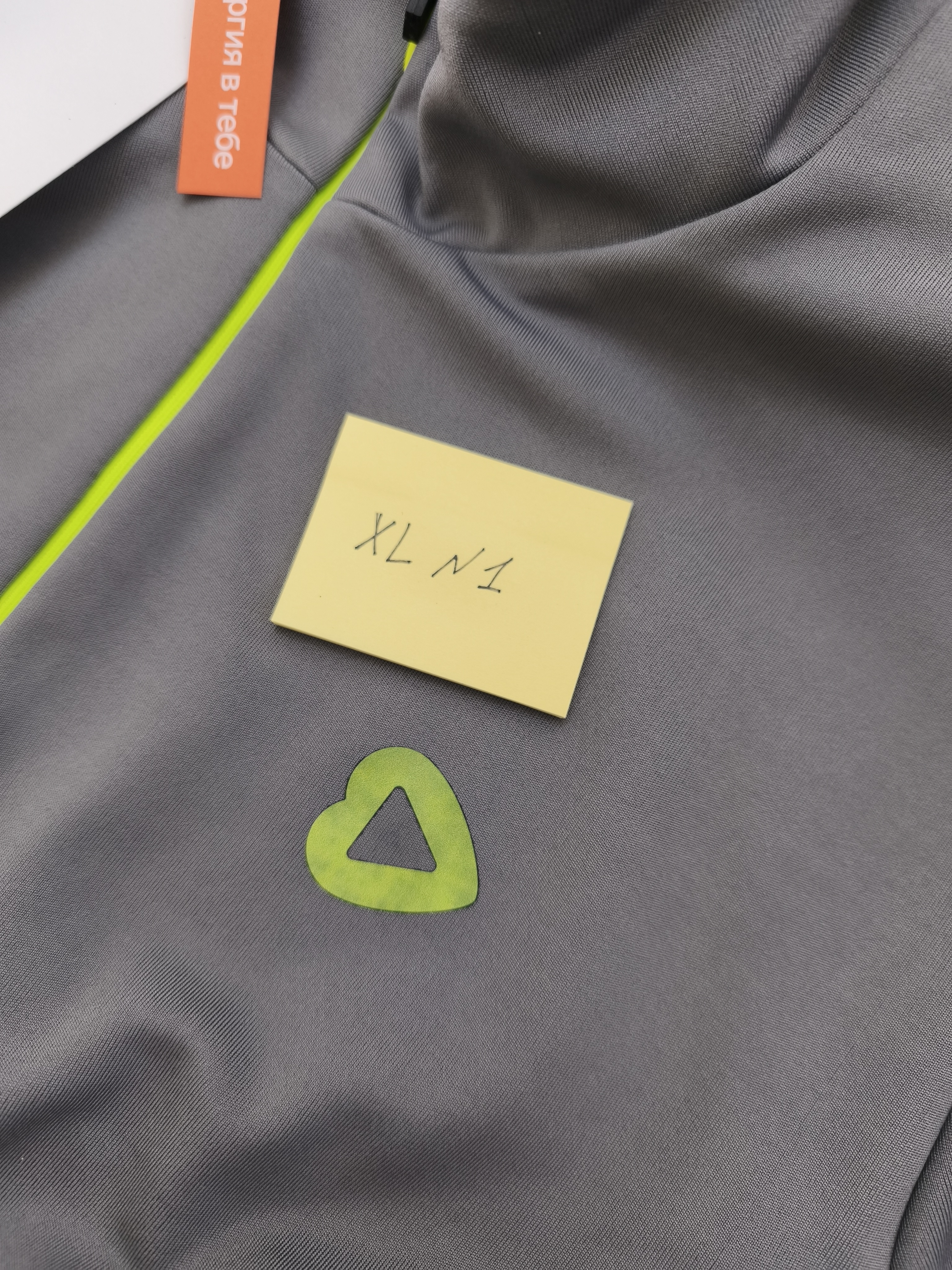 Лонгсливы в сером оттенке с акцентной неоновой молнией - абсолютно идеально ошиты, но в зоне брендинга (логотип сердечко) фрагментами стал меняться цвет.